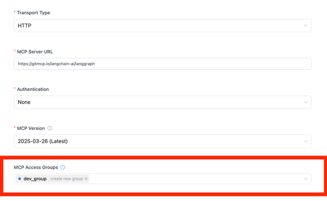 • Under "MCP Access Groups", create a new group (e.g., "dev_group") by typing it