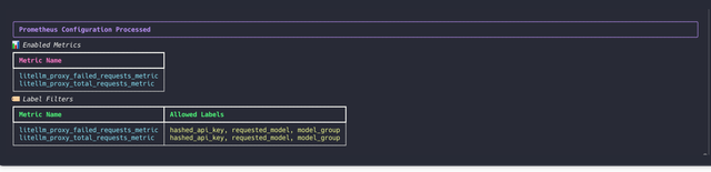 On starting up LiteLLM if your metrics were correctly configured, you should see the following on your container logs